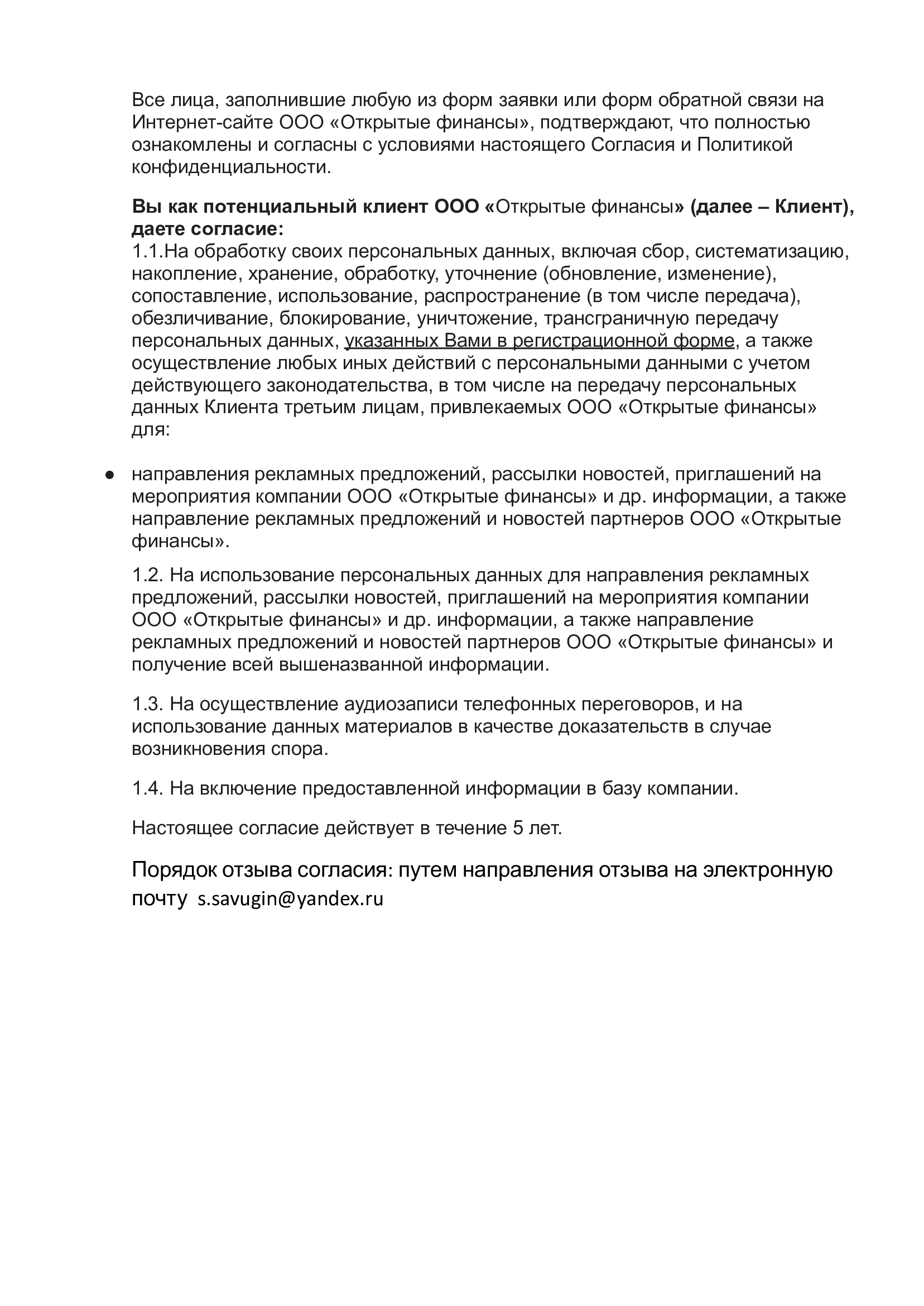 ПРЕДМЕТ ПОЛИТИКИ КОНФИДЕНЦИАЛЬНОСТИ 3.1. Настоящая Политика конфиденциальности устанавливает обязательства Администрации сайта по неразглашению и обеспечению режима защиты конфиденциальности персональных данных, которые Пользователь предоставляет по запросу Администрации сайта при оформлении заказа на услугу. 3.2. Персональные данные, разрешённые к обработке в рамках настоящей Политики конфиденциальности, предоставляются Пользователем путём заполнения регистрационной формы на Сайте «Открытые финансы» в разделе «Онлайн заявка», «Отправить заявку», «Получите бесплатную консультацию», «Оформить заявку», «Форма обратной связи», и иных формах захвата и включают в себя следующую информацию: 3.2.1. имя Пользователя; 3.2.2. контактный телефон Пользователя; 3.2.3. имя и контактный телефон Пользователя; 3.2.4. email Пользователя; 3.2.5. имя, контактный телефон, email Пользователя. 3.4. Любая иная персональная информация неоговоренная выше (история покупок, используемые браузеры и операционные системы и т. д.) подлежит надежному хранению и нераспространению, за исключением случаев, предусмотренных в п. 5.2. настоящей Политики конфиденциальности.