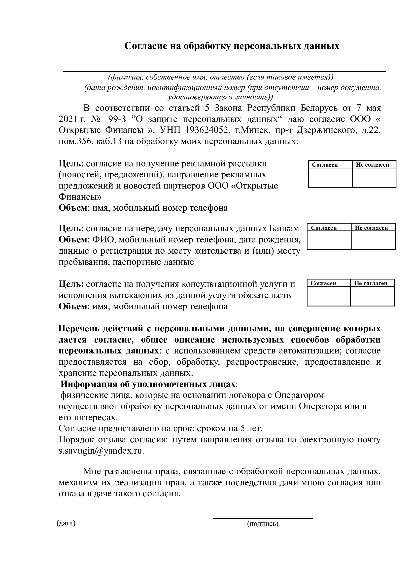 г. Минск 15.01.2021 г. Настоящая Политика конфиденциальности персональных данных (далее — Политика конфиденциальности) действует в отношении всей информации, которую Интернет-сайт ООО «Открытые финансы», сможет получить о Пользователе во время использования Интернет-сайта (далее — Сайт), программ и продуктов «Открытые финансы».