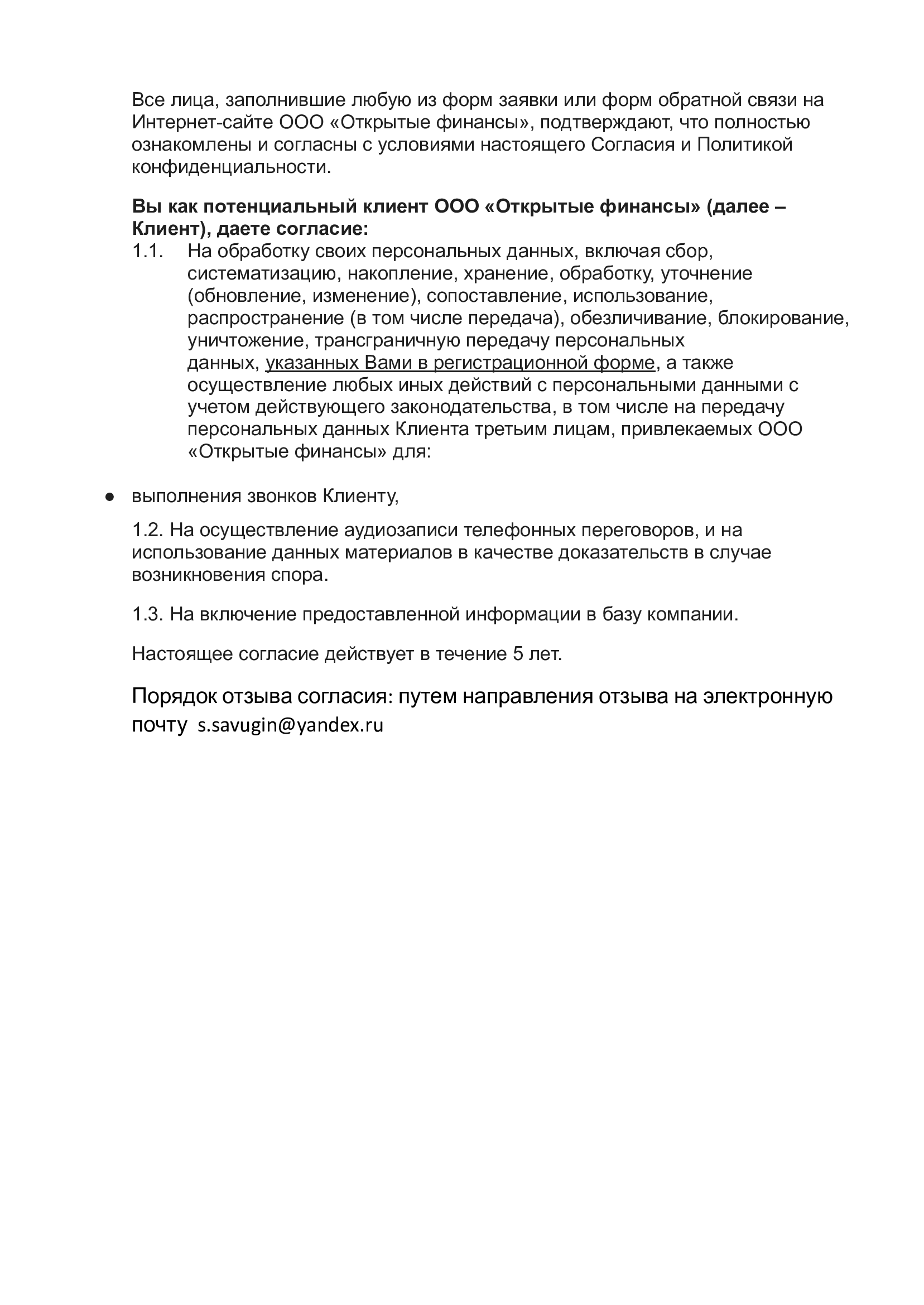 ПРЕДМЕТ ПОЛИТИКИ КОНФИДЕНЦИАЛЬНОСТИ 3.1. Настоящая Политика конфиденциальности устанавливает обязательства Администрации сайта по неразглашению и обеспечению режима защиты конфиденциальности персональных данных, которые Пользователь предоставляет по запросу Администрации сайта при оформлении заказа на услугу. 3.2. Персональные данные, разрешённые к обработке в рамках настоящей Политики конфиденциальности, предоставляются Пользователем путём заполнения регистрационной формы на Сайте «Открытые финансы» в разделе «Онлайн заявка», «Отправить заявку», «Получите бесплатную консультацию», «Оформить заявку», «Форма обратной связи», и иных формах захвата и включают в себя следующую информацию: 3.2.1. имя Пользователя; 3.2.2. контактный телефон Пользователя; 3.2.3. имя и контактный телефон Пользователя; 3.2.4. email Пользователя; 3.2.5. имя, контактный телефон, email Пользователя. 3.4. Любая иная персональная информация неоговоренная выше (история покупок, используемые браузеры и операционные системы и т. д.) подлежит надежному хранению и нераспространению, за исключением случаев, предусмотренных в п. 5.2. настоящей Политики конфиденциальности.
